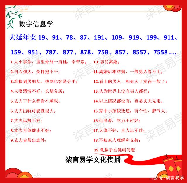 女性手机号码中有19,91,78,87组合者即为大延年女,就是所谓的“女强人”有以下特征: